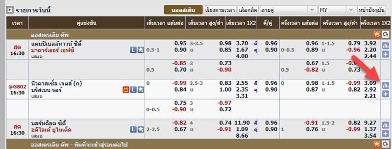 เมื่อคุณเข้าแทงบอล วันนี้คุณจะเห็นรายการและตารางการแข่งขันฟุตบอลที่จะมีการแข่งขันในวันนี้ คุณจะต้องเลือกคู่แข่งขันที่คุณสนใจและมีความรู้เกี่ยวกับทั้งสองทีมหรือคุณสามารถเลือกดูข้อมูลเกี่ยวกับคู่การแข่งขันนั้นๆได้ที่ปุ่มสถิติด้านท้ายตารางการแข่งขัน (ตามภาพ)